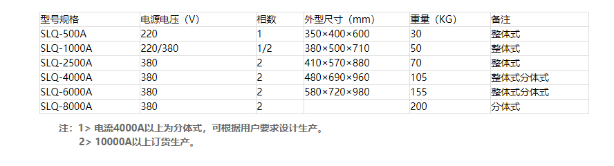 SLQ系列大电流发生器是一种作为检验用的电流源,对电器做热稳、动稳定的低压大电流源,如空气断路器、接触器、继电器的温升试验及脱扣等。